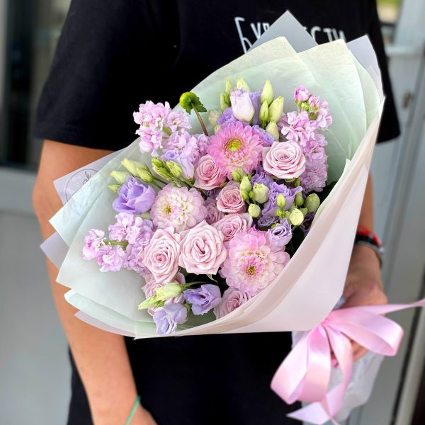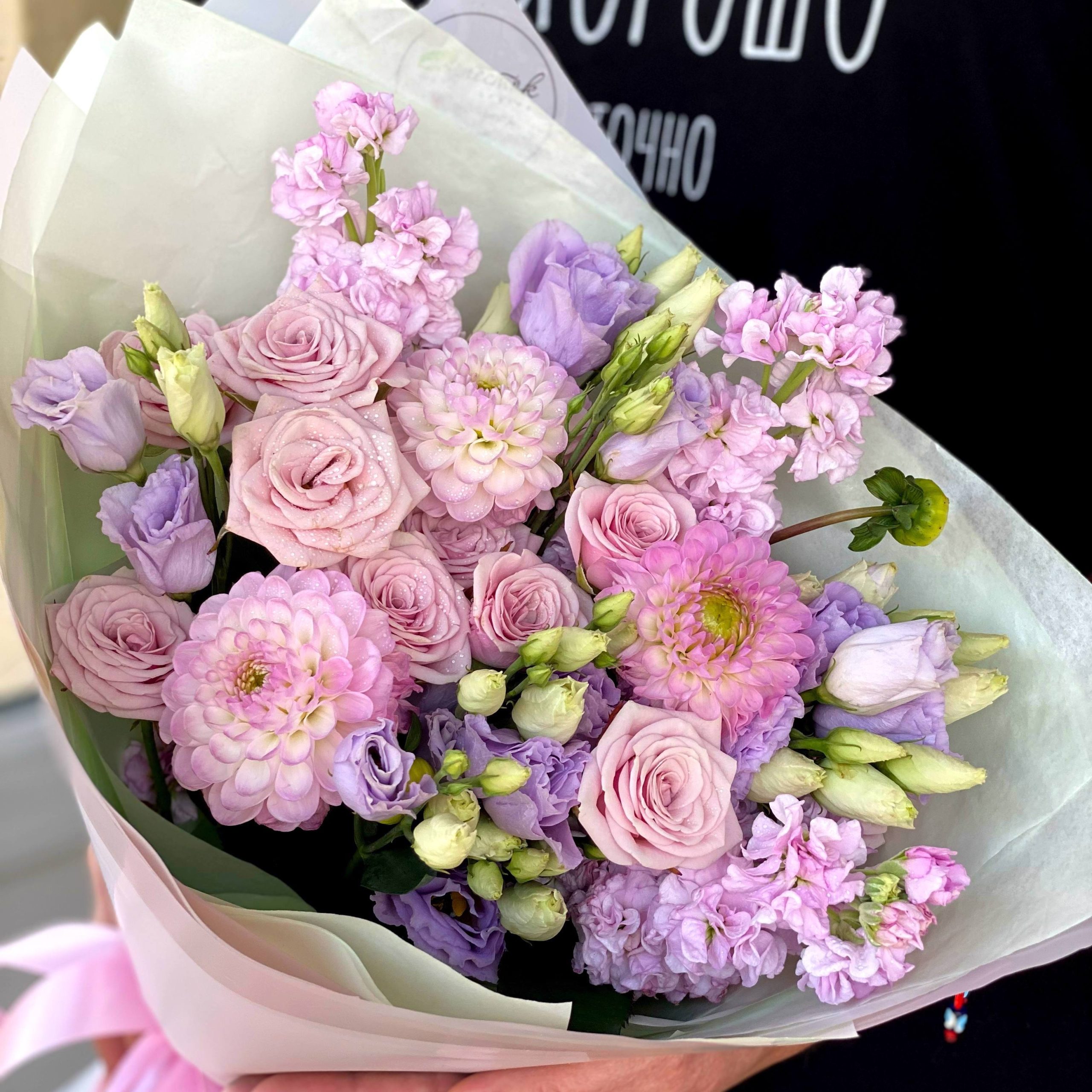 Осенний букет из георгин, маттиол и эустомы в Бакале